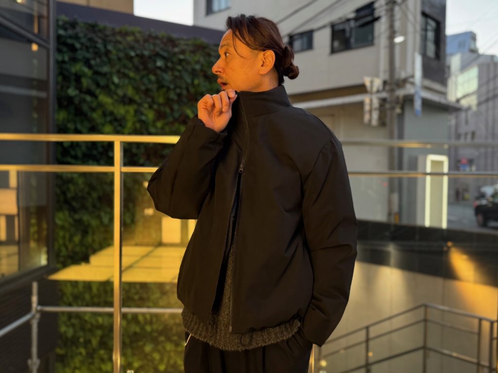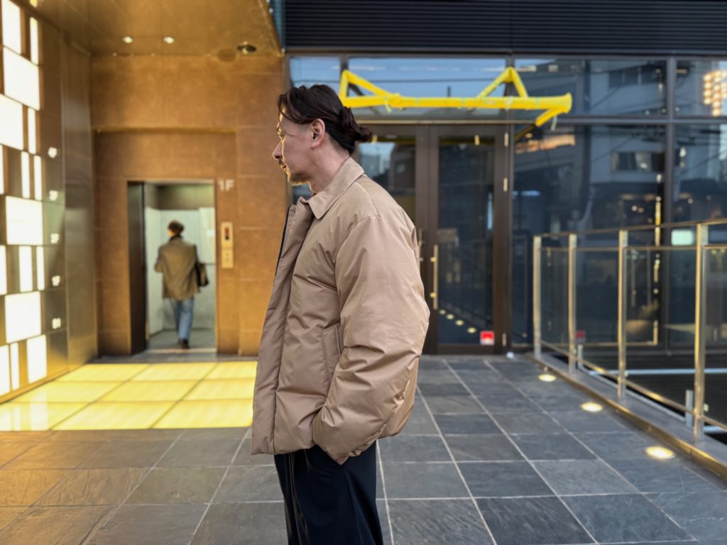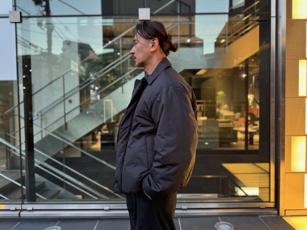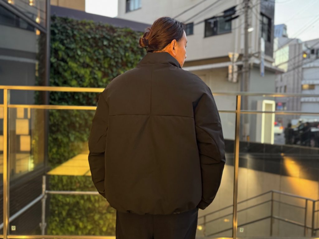 こちらは立ち襟タイプで切り返しや縫製、ジッパーなども抑えた究極にミニマルなデザインのダウンジャケット。
