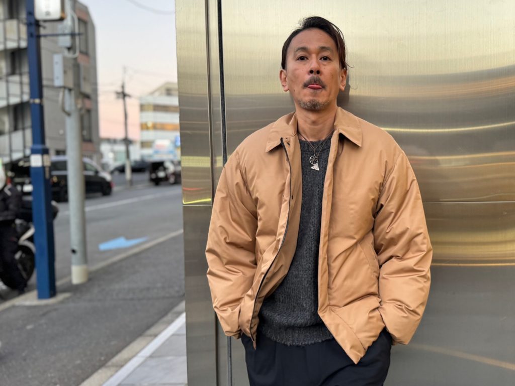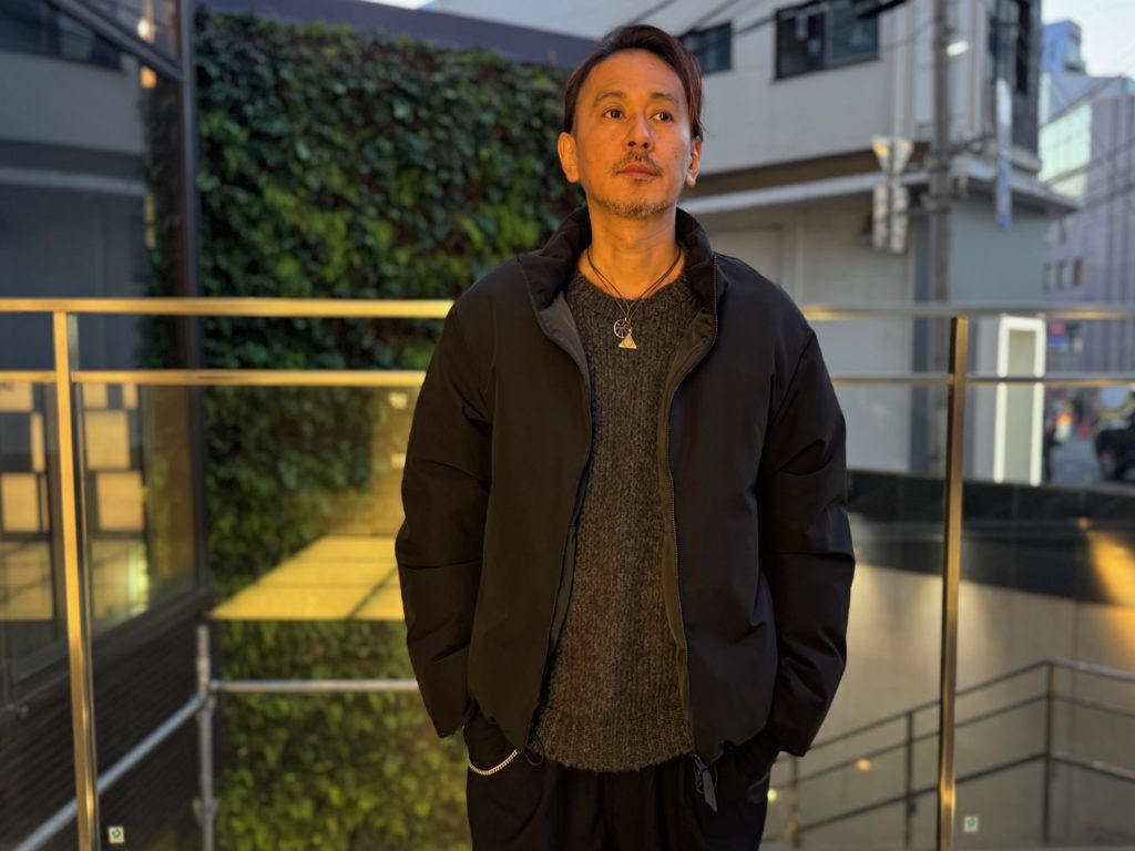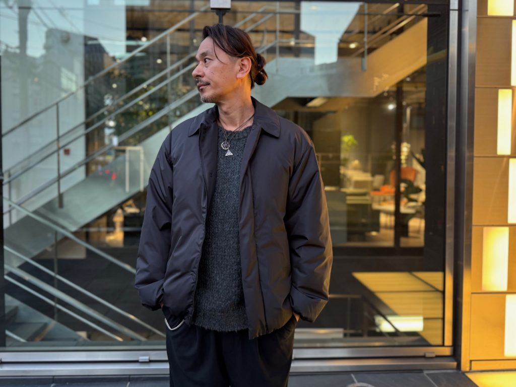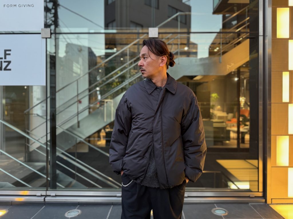 こちらは立ち襟タイプで切り返しや縫製、ジッパーなども抑えた究極にミニマルなデザインのダウンジャケット。