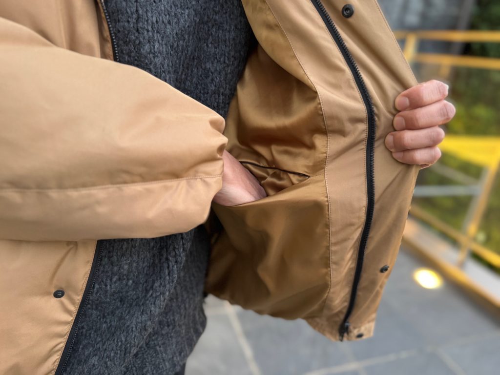 下側だけを開いたスタイルが私的に好みで、内ポケットから荷物も取り出しやすいし、ダウンを着たまま座ったり車の運転の際なども便利に感じます。