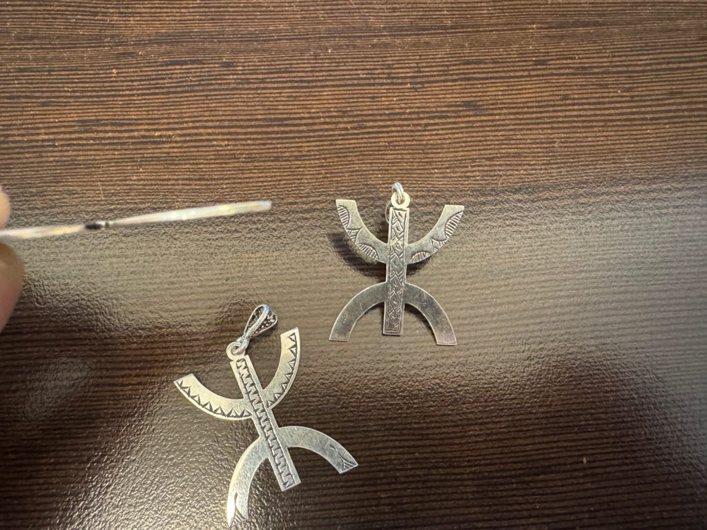 大きめなサイズが多いトゥアレグのペンダントトップの中でも、比較的小さめでシンプルなデザインになり、サイズは3~3.5センチほどで厚みは約1㎜ほど。