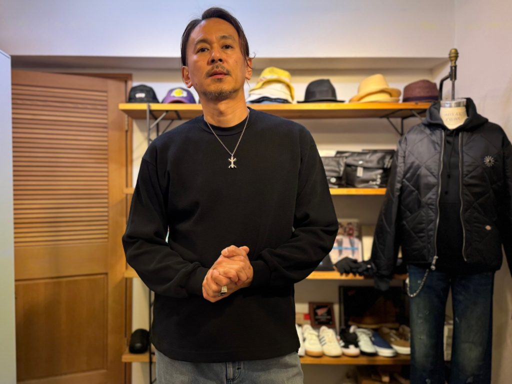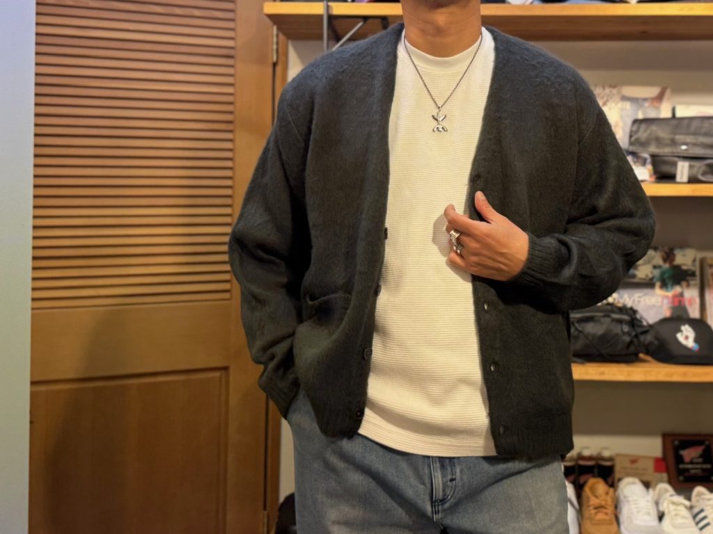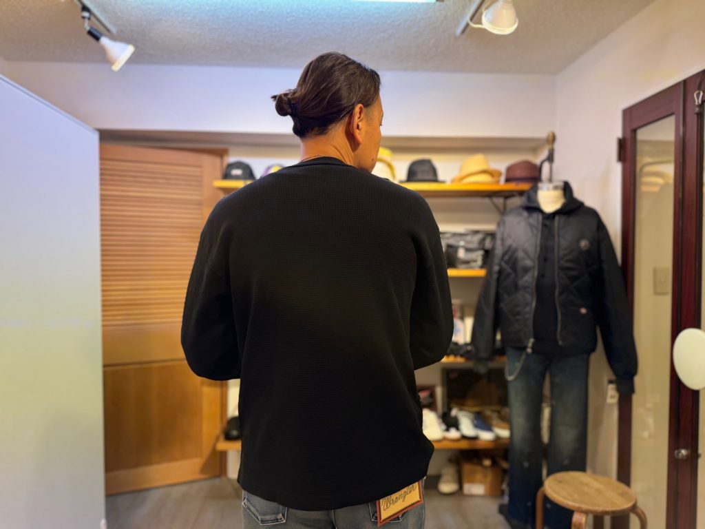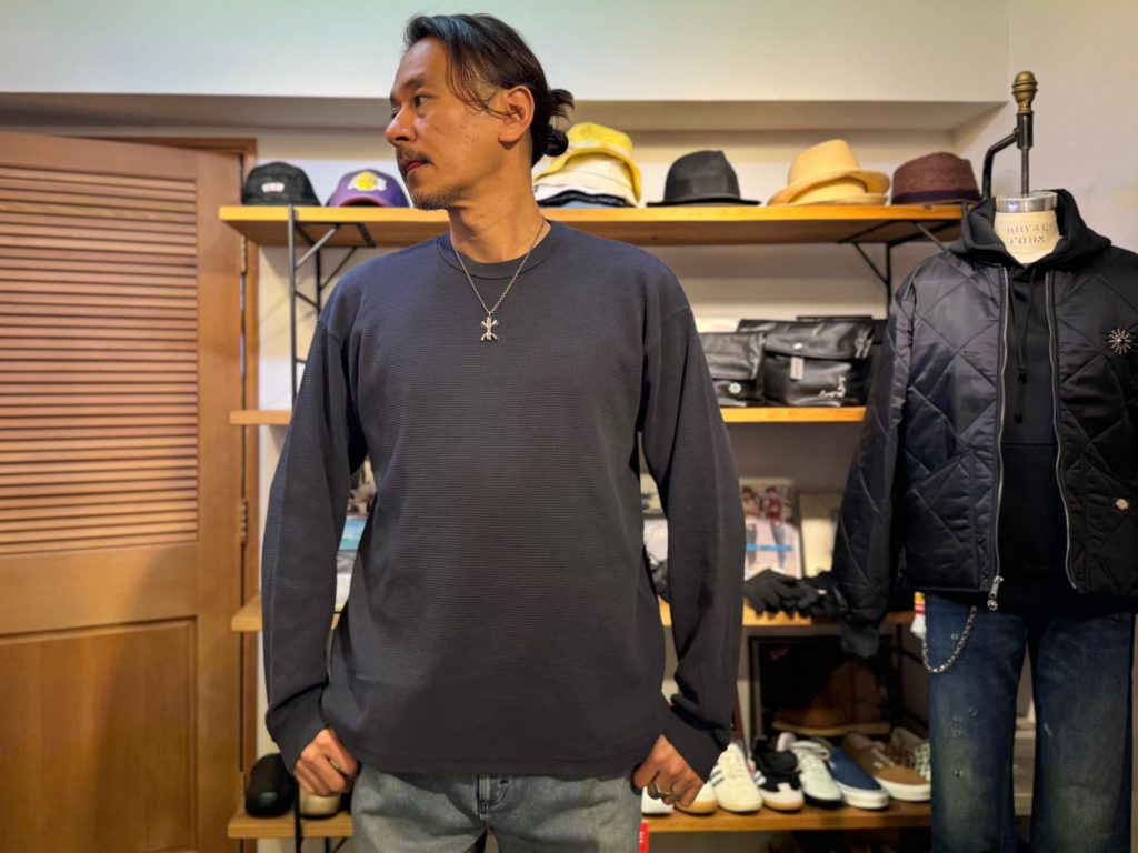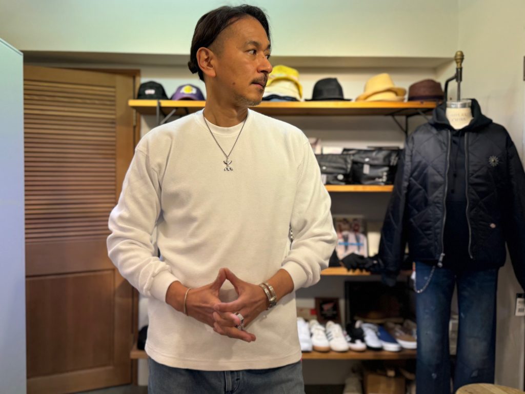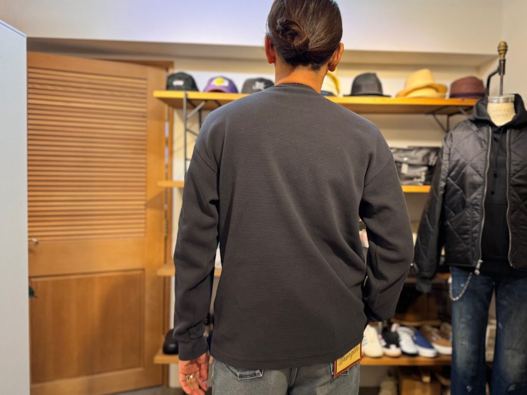 オンラインストアではゆったりとLサイズを着用しているので、このブログではMサイズの着用画像を掲載してみたのでサイズ感の参考までに。